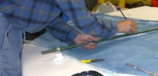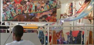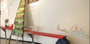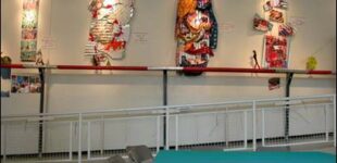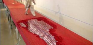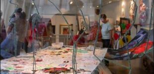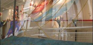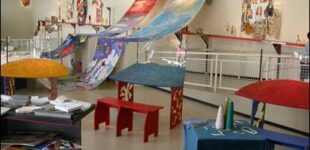- Two large canvasses labeled “Our skies” and “Our island”. “Our skies” would jolt out from the center of the wall, fly over the ramp and land on a low table where “Our island” would actually lie, embroidered and ready to be embroidered more by visitors.
