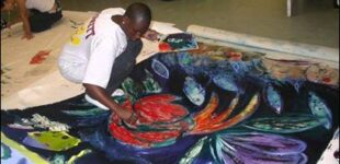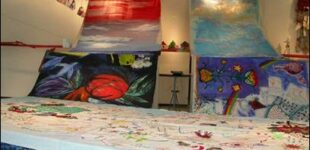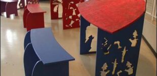 - Three tables, coated with wax of three different colors and engraved with texts in different languages would depict, in simple words, the three major elements spoken of above: – bridge, red table (I walked , I starved, I went on… I was there), – objects, yellow table (See me carve, make bags, embroider… I am here), – sky, the canvas, blue table ( I will fly, imagine … the sky will be free, and my children too…). All vertical supports for the tables show different cut-outs which are taken from drawings by participants.